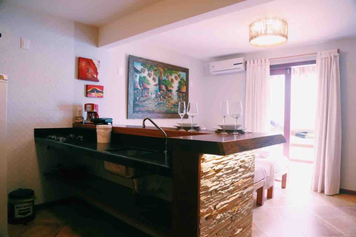 Apartamento ubicado a 250 metros de la plaza principal de Jeri. Compuesto por una suite con balcón, una cama doble (tamaño queen) y otro espacio (con armarios en ambos) con cocina abierta y balcón. Equipado con un televisor inteligente de 43 pulgadas, nevera, horno microondas, placa de cocción, licuadora, sandwichera, cafetera, utensilios y platos para 4 personas. Este entorno tiene 2 camas individuales. El baño del apartamento tiene una ducha eléctrica y 2 puertas con acceso independiente a las 2 habitaciones.