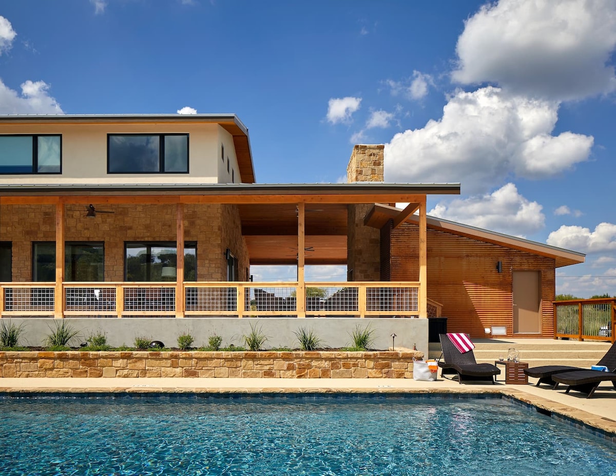 Moderno oasis de Hill Country con piscina, bañera de hidromasaje, fogata