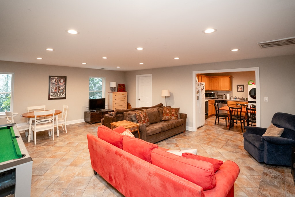 ¡Relájate y descansa en la terraza extragrande de la parte trasera! ¡Este garaje convertido en una cueva para hombres está recién terminado y no se ha escatimado ningún detalle al hacerlo! Ya sea que necesites un lugar para recargar energías durante la noche o planees quedarte un tiempo, ¡este espacio lo tiene todo! ¡Mini split en el dormitorio y sala de estar con controles separados, baño de gran tamaño con ducha grande y cama tamaño queen súper cómoda! Cocina completa con amplio espacio para preparar comidas y cenar en la mesa. ¡El sofá/futón es muy cómodo y de gran tamaño para huéspedes adicionales!