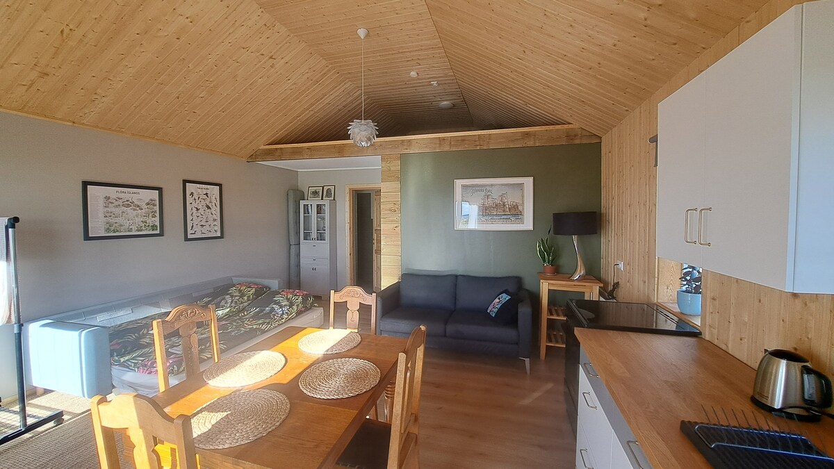 Una cabaña pequeña y acogedora en la tranquilidad del campo, justo debajo de una montaña con un hermoso glaciar como vecino. Con dos dormitorios, una cama doble y dos camas individuales, comedor y sala de estar, con televisión y wifi gratuito, cocina bien equipada. Gran patio con muebles exteriores y barbacoa. Ideal para unas vacaciones tranquilas en el campo con hermosos terrenos de senderismo, bañeras de hidromasaje geotérmicas a pocos pasos y naturaleza por todas partes, y vistas espectaculares de las luces del norte durante el invierno.
