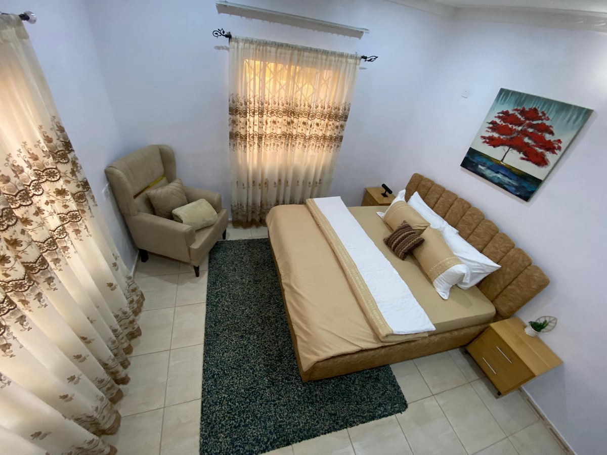 Situado en una zona tranquila. 2 dormitorios en suite, 2 salas de estar con aseo, internet y TV vía satélite, cocina funcional, recinto vallado con amplio aparcamiento y zonas de estar al aire libre. Área de estudio dedicada opcional. Energía de respaldo, agua potable y lavadora disponibles. Ubicación céntrica para llegar al centro de la ciudad de Jos y Bukuru con facilidad.