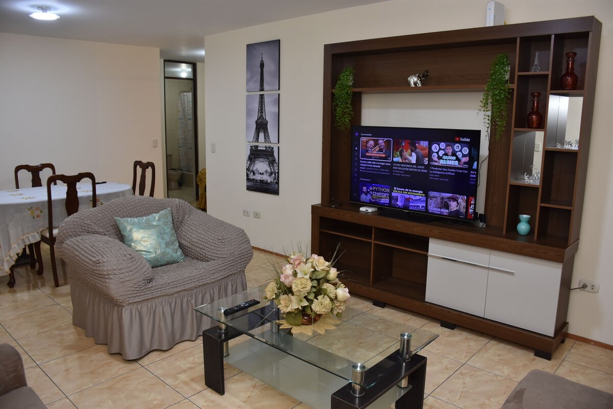 Disfruta de la sencillez de este alojamiento tranquilo y céntrico. Departamento completo ideal para turistas,familias,parejas o amigos. estamos a 10 del centro de la ciudad en auto. El departamento cuenta con 2 habitaciones, una habitación con cama de 2 plazas, tv y baño propio,la otra habitación con 2 camas de plaza y media, tv y baño compartido. Sala con tv e Internet, comedor cocina equipada y lavanderia. Estamos a 5 minutos de los principales Malls,cerca de farmacias,restaurantes .