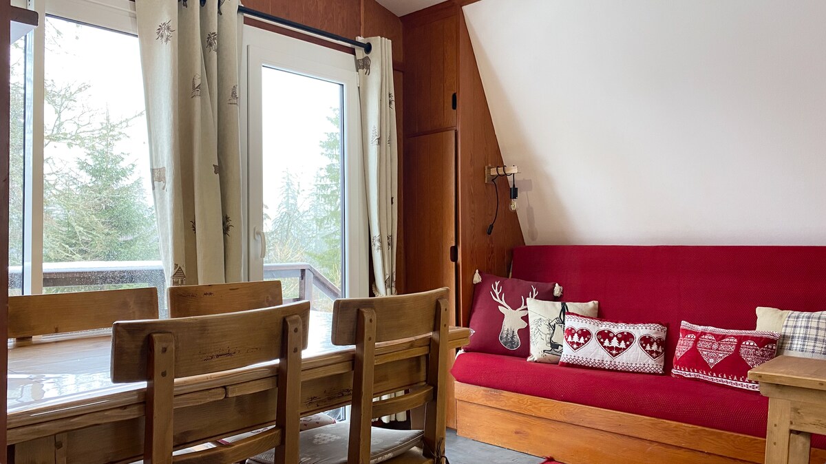 Vivez une expérience unique connectée à la nature dans un petit chalet insolite de 40m2 très bien équipé placé dans une copropriété calme où vos enfants pourrons jouer en toute sécurité. Idéalement situé dans la station des Rousses, sur les pistes de ski alpin des Jouvencelles. Nombreuses randonnées et piste de luge sur place. Baignade au lac à 10min. Local vélo et ski privé. Accès facile en voiture, parking gratuit déneigé. Sans linge. Ménage 25€.