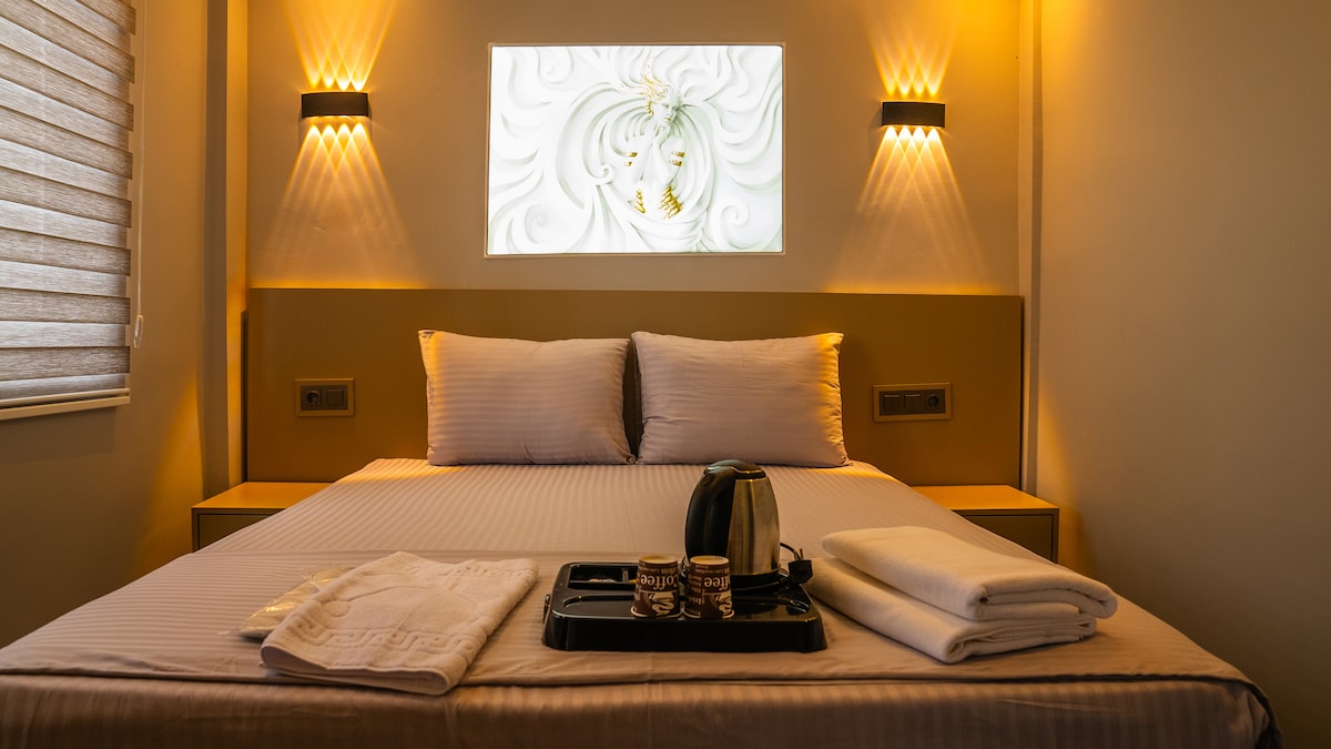 Este espacioso estudio ofrece una cama doble y una amplia sala de estar. La sala de estar tiene un sofá grande que se puede utilizar como cama para el huésped adicional. El estudio ofrece una pequeña cocina privada y un baño privado con jacuzzi de tamaño medio (140 cm *80 cm). Hay un portero las 24 horas y una vez cada 2 días de servicio a la habitación. El baño turco debe reservarse a la llegada para la entrada gratuita. Además, mis huéspedes tendrán un descuento del %10 en el restaurante. Indica que eres huésped de Yusuf:)