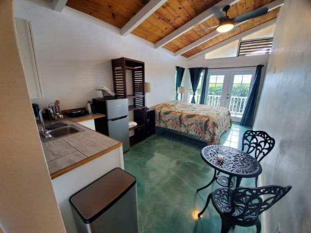 Located conveniently 5 minutes from the airport and a short 15 min drive to downtown Kailua Kona. Vaulted ceilings, a cute lanai to enjoy your morning coffee, large bathroom with double vanity, and a kitchenette make this rental a real gem. The AC is powerful for when the tropical breeze isn't quite cool enough, The WIFI is reliable and there is a large screen TV with ROKU for when you just want to hang out. We offer automated check in, excellent room amenities and flexibility with booking.