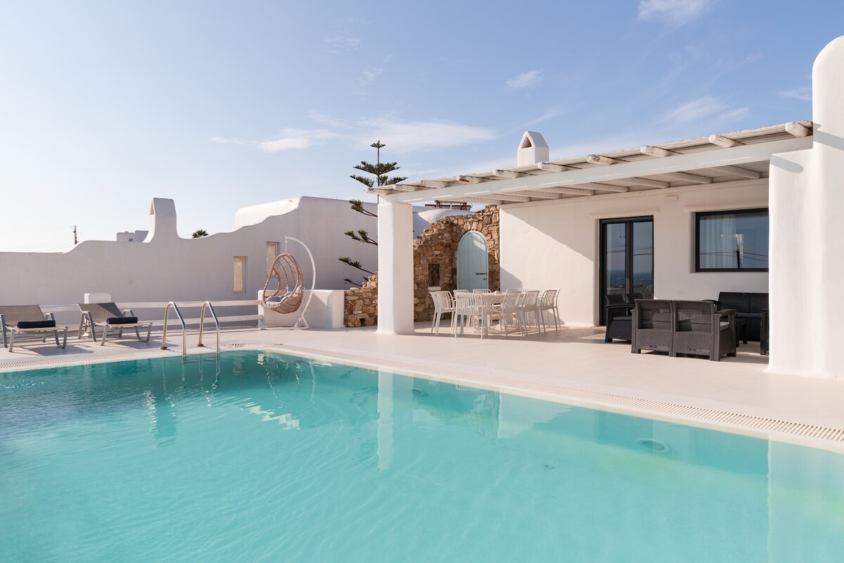 Una villa privada que combina armoniosamente la estética moderna con la arquitectura clásica de las Cícladas, ofreciendo una escapada lujosa y relajante. Ubicada en Kalo Livadi, a solo 2 minutos en auto de la playa, la villa cuenta con una piscina privada climatizada con una esquina de jacuzzi de dos plazas. Está construido en dos pisos con entradas separadas para garantizar la independencia de los huéspedes.