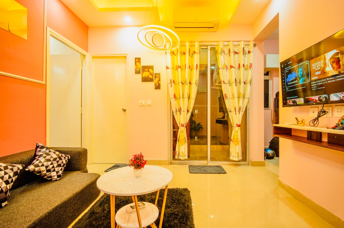 Indulge in luxury at this stylish studio apartment located near the airport and CC2 Mall. Perfect for couples, families, and friends looking for a special getaway. With a high-speed internet of over 100 Mbps, this apartment is also ideal for those working from home. Enjoy access to the on-site pool and gym, and stay connected as the property is well situated near major attractions: 6 km from Kolkata International Airport, 1 km from City Centre II, and 2 km from Eco Park.