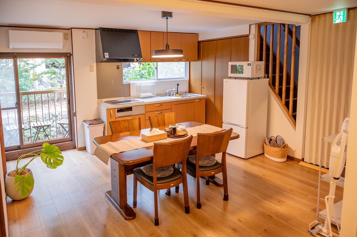 Kyomachiya Private Lodging "Takasegawa Shichijo" es una kyomachiya de 115 años totalmente renovada. La kyomachiya, que forma el hermoso paisaje de Kioto, ha sido remodelada en un edificio con alta hermeticidad y rendimiento de aislamiento térmico para que puedas pasar un tiempo cómodo en los veranos húmedos y los inviernos fríos únicos de Kioto mientras conserva la estructura original. Desde la habitación de estilo japonés en el primer piso, se puede ver el jardín tsubo (un jardín que conduce a la sala de té) con una imagen "roji". Además, hemos preparado un sofá en el pasillo para que puedas relajarte y disfrutar de la vista del jardín tsubo. Por la noche, puedes pasar un rato relajante mientras miras el jardín tsubo iluminado. Hay 2 dormitorios en el segundo piso, uno con 2 camas individuales y uno con 1 cama doble. Si hay 5 o más huéspedes, podemos preparar un futón en la habitación de estilo japonés en el primer piso y usarlo como dormitorio, aunque es un poco molesto. La cocina está equipada con utensilios de cocina y platos para cocinar de forma sencilla.