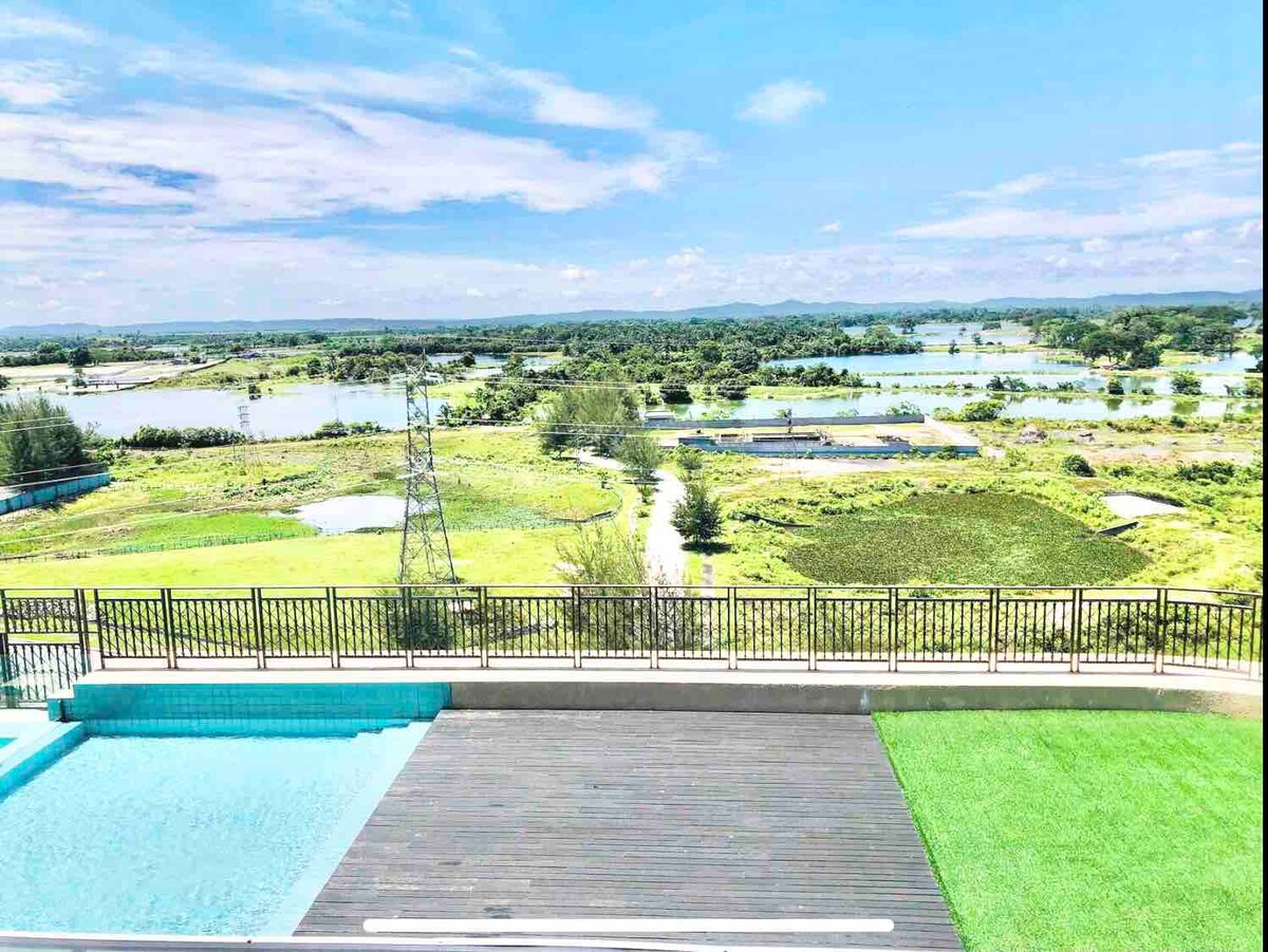 Unidad de esquina de piso alto con 2 balcones donde puedes disfrutar de vistas panorámicas a la montaña y al lago. El espacio está equipado con una cama tamaño king. - Aire acondicionado - Ventilador de techo. - Dispensador de agua - Calentador de agua - Secador de pelo - Lavadora - Toallas. - Refrigerador. - Microondas. - Platos, tazones y cubiertos. ■ A 5 minutos en auto de UTAR ■ Seguridad las 24 horas Estacionamiento interior■ gratuito ■ 99 speed mart cerca