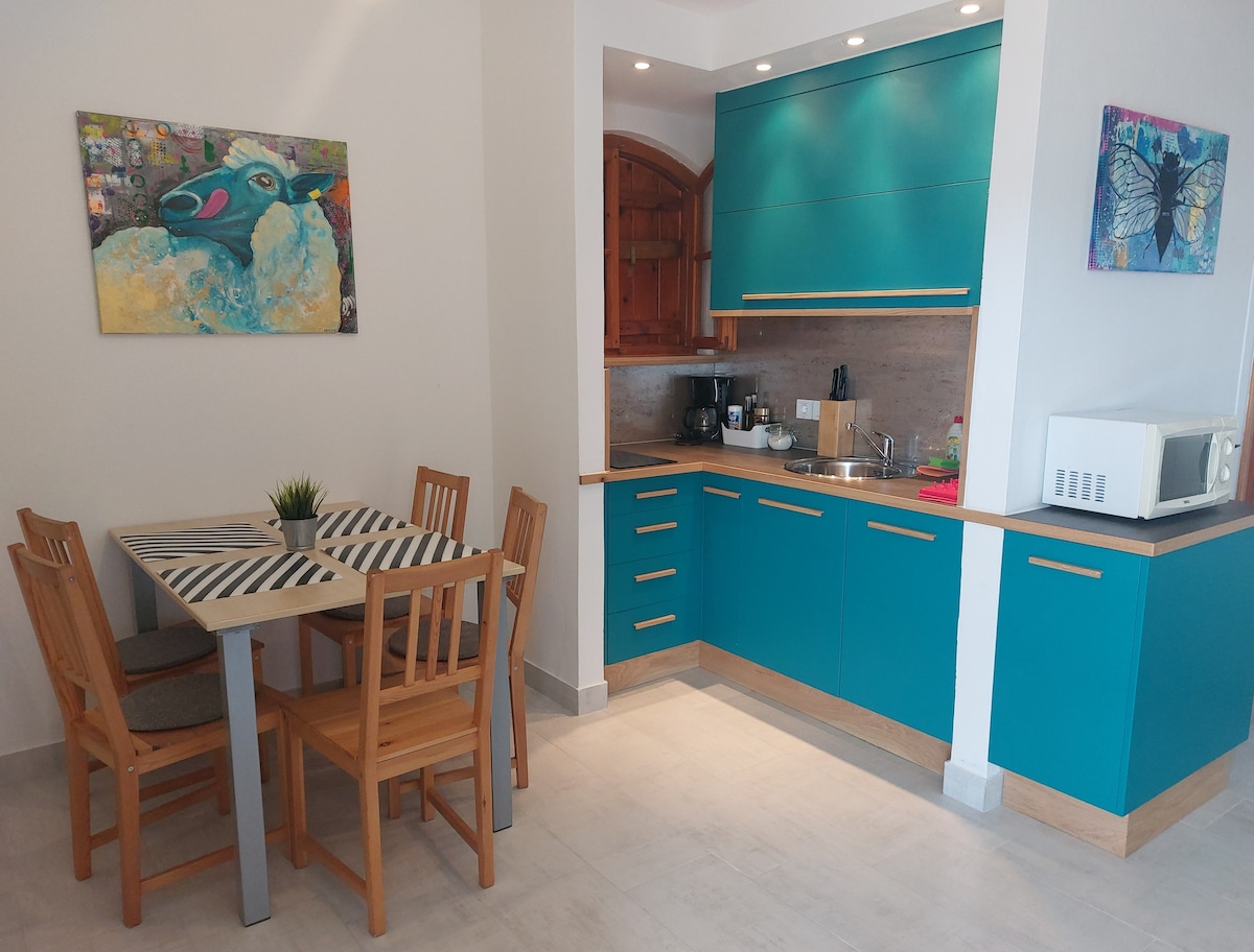 El apartamento estudio es un espacio cómodo para dos personas. Cuenta con una pequeña cocina, nevera y mesa. Está situado en la primera planta. El apartamento tiene un balcón rodeado de vegetación y vistas al jardín. Está oculto a la vista de los transeúntes, excepto de nosotros cuando estamos en el jardín. El estudio cuenta con baño privado con bañera.