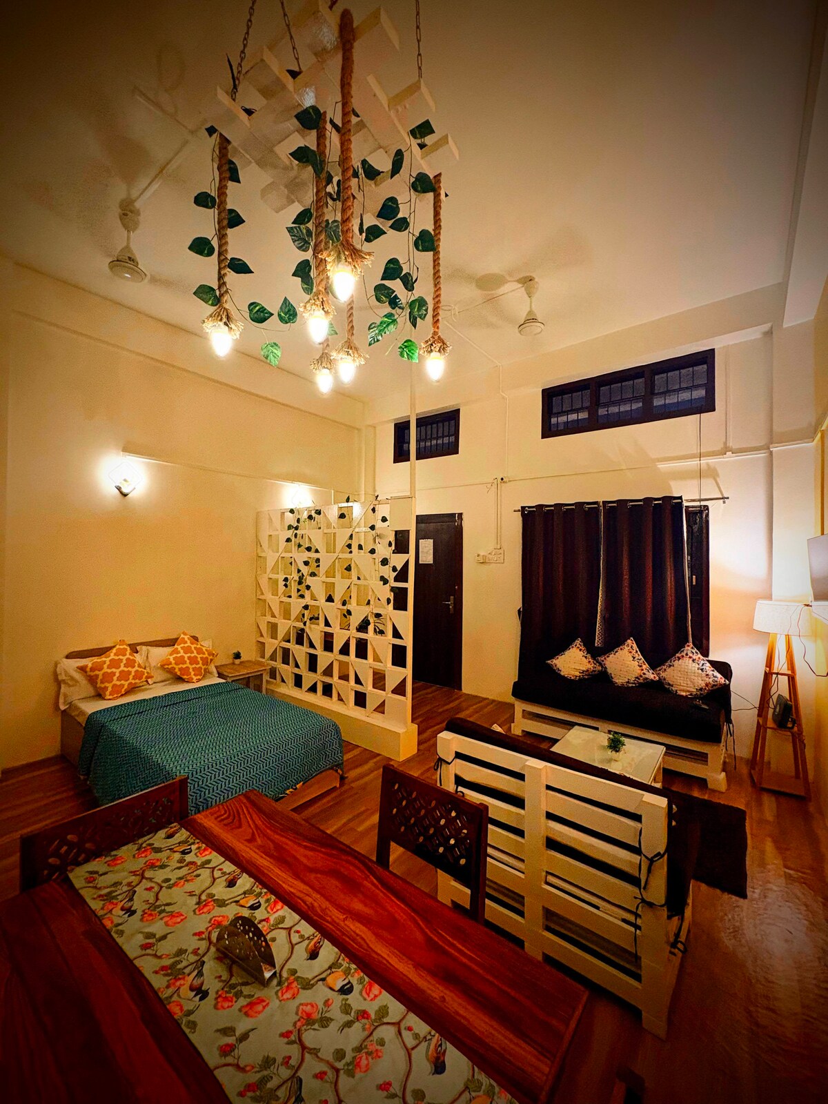 Este es un estudio sofisticado, de inspiración bohemia, de planta abierta de 612 pies cuadrados, ubicado a 3 kilómetros de Dispur. Accesible a 40 minutos del aeropuerto y a 24 minutos de la estación de tren de Guwahati, esta acogedora casa en la planta baja combina comodidad y comodidad moderna, ideal para parejas, viajeros solitarios o familias pequeñas que buscan una estancia cómoda y conveniente en Guwahati. Nos encargamos de todos los elementos básicos para que puedas centrarte en disfrutar de tu viaje.