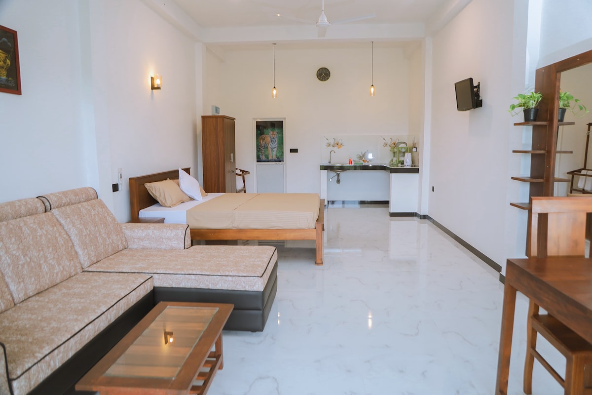 Escape to tranquility at Nuki Eco Villas, nestled amidst lush paddy fields and offering stunning views. Our cozy villa, perfect for 2 adults and 1 child, provides a peaceful haven for relaxation and remote work. Enjoy easy access to the pristine Weligama beach, just a short bike ride or tuk-tuk journey away. Immerse yourself in nature's beauty while practicing yoga in our serene surroundings. with wifi, Nuki Eco Villas is your ideal destination for a rejuvenating getaway.