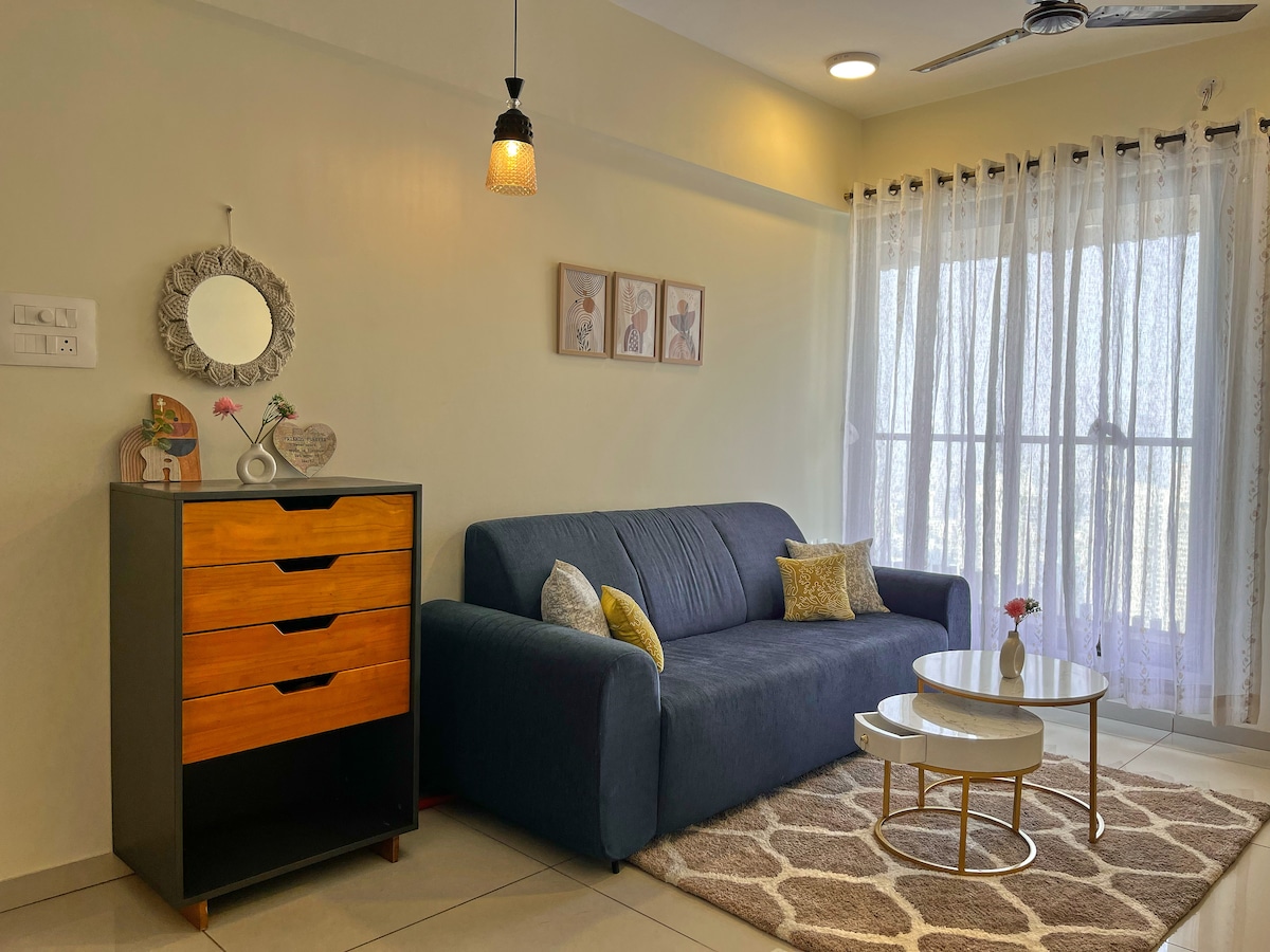 Simple minimalistic living.All spaces have neutral tones.Lighting is done to illuminate the space nice & bright but not to hit your eyes directly.The pool, gym and sauna can rejuvinate you, along with a kids play area for your child.We have a mountain view overlooking lush greenary.Rainy days are treat to eyes.King size bed and king size sofa bed for better comfort. It was furnished for our own stay, so enjoy and take care of our small cozy apartment as your own. Mi Casa , Su Casa !!