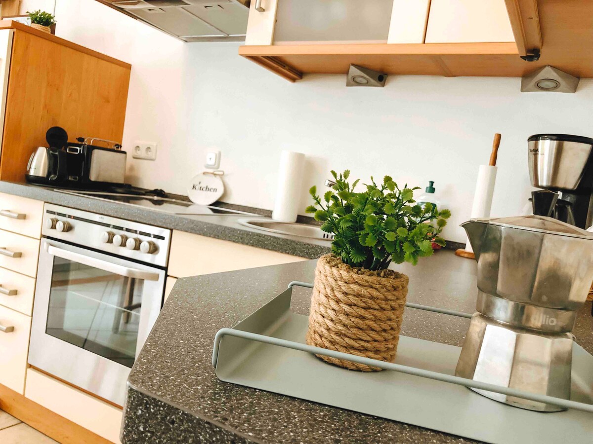 Hola en el apartamento de dos personas. Aquí podéis con máx. 2 personas en 41 metros cuadrados, en un ambiente elegante y acogedor para descansar. Por la mañana, disfrute de su desayuno en la terraza o en la cocina totalmente equipada, por la noche, su barbacoa en la zona de barbacoa. Cuando haga mal tiempo, podéis poneros cómodos en el sofá frente al televisor inteligente de 50" o leer vuestro libro favorito en la mecedora. En la cama king size box spring podréis descansar para empezar el día siguiente recuperados. Paquete de ropa de cama incluido