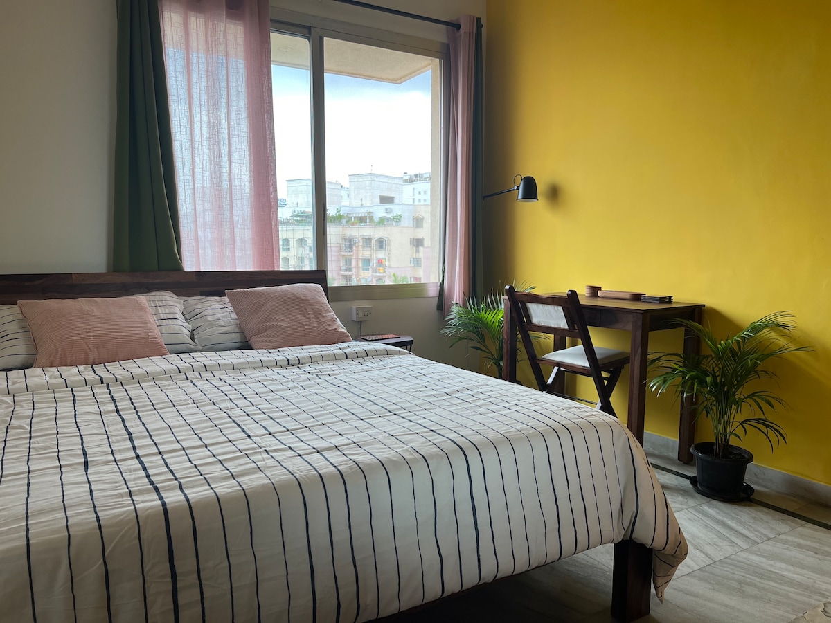 ¡No hay aire acondicionado, chicos! Esta acogedora habitación+ cocina americana + baño con terraza privada se encuentra en los elegantes carriles de Indiranagar. La habitación es pequeña y está en el cuarto piso ( sin ascensor), pero la ventaja es que tienes acceso privado a una hermosa terraza que ofrece algunas impresionantes vistas al atardecer. Estrictamente para personas solteras. Está a 5 minutos caminando de los centros comerciales, cafeterías y restaurantes de 100 pies y 12. - Puedes tener un máximo de 2 huéspedes y deben salir antes de la tarde.