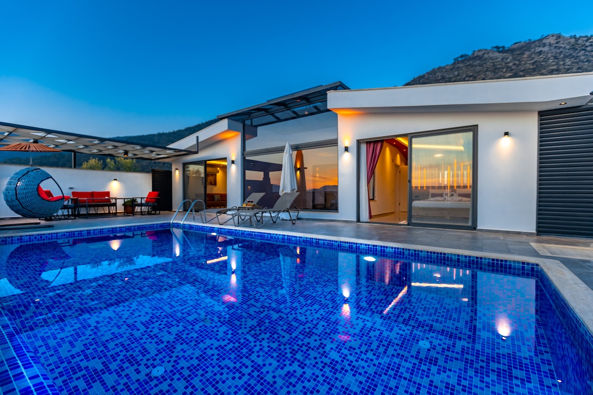 Nuestra villa, que está a unos 3 km del centro de Kalkan, tiene jacuzzi y baño privado en el dormitorio. Hay una cocina abierta combinada disponible con el salón. Hay una mesa de comedor, 2 tumbonas, chimenea y un columpio para 2 personas en la gran terraza de la piscina; hay muebles, cocina y materiales y materiales que puedes necesitar en nuestra villa. Aunque la piscina de nuestra villa está en lo alto del suelo, la terraza de la piscina está rodeada de vallas de madera y protegida. Todo ha sido considerado para familias conservadoras y parejas de luna de miel.
