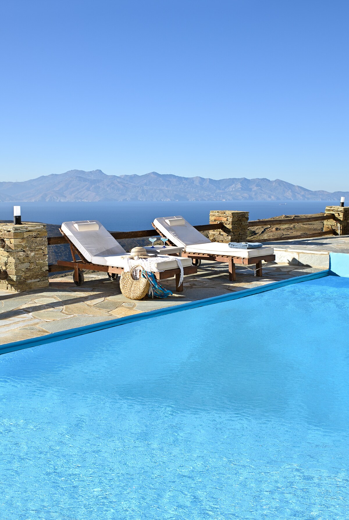 The house with private infinity edge pool is built on the top of a cliff situated right above the port offering stunning views of Gavrio and of the sun sinking in the Aegean Sea. The closest beach of Fellos is approximately 5min driving and 25min walking. The house is ideal for couples, friends and families. It can host 2-6 people, i.e. one or two couples, families of up to six members or a company of 2-6 friends.