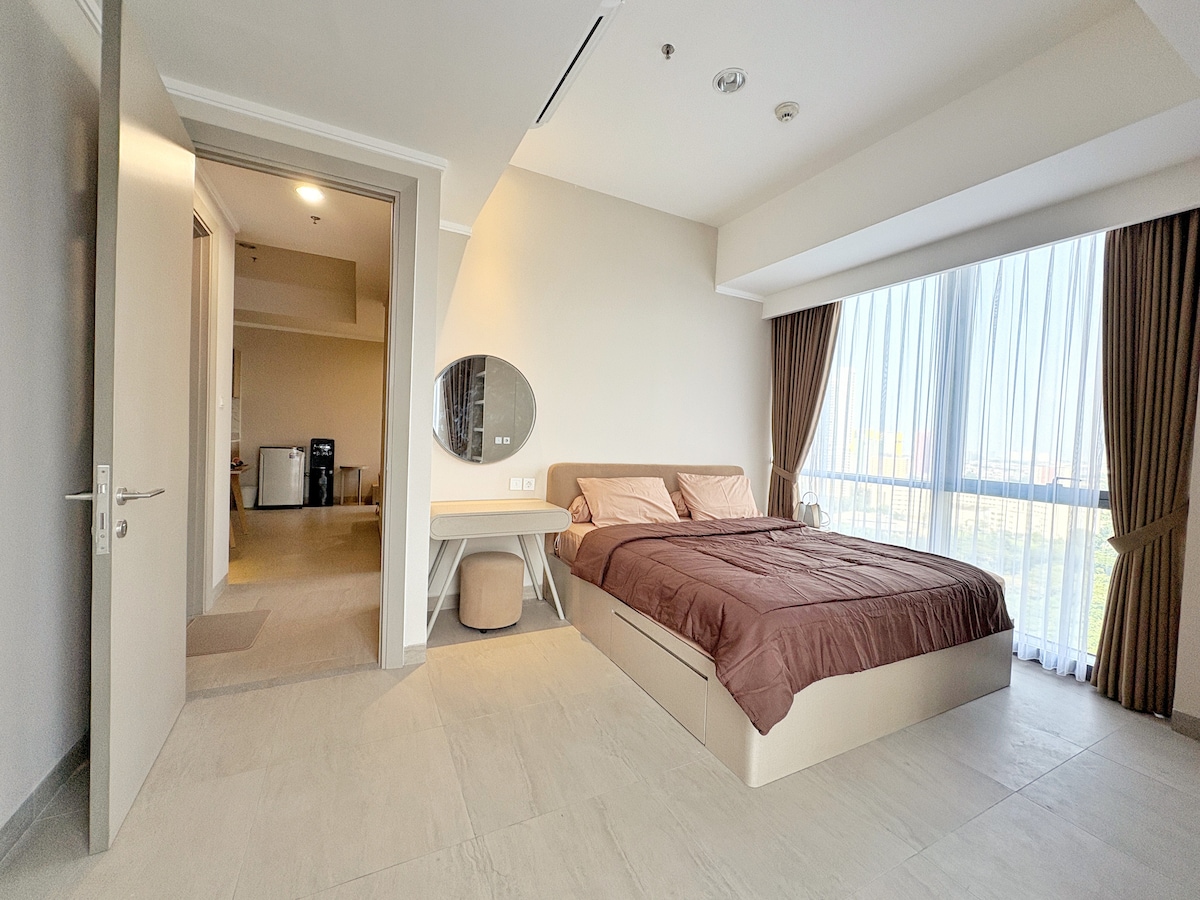 Apartamento recién renovado. Quédate con toda la familia en nuestro acogedor y espacioso lugar, con 2 dormitorios y 1 sofá cama en la sala de estar, se adapta a 6 huéspedes en total. Justo en el complejo más grande del centro comercial de Indonesia (MOI), toneladas de restaurantes, tiendas y actividades divertidas para ti y toda la familia.