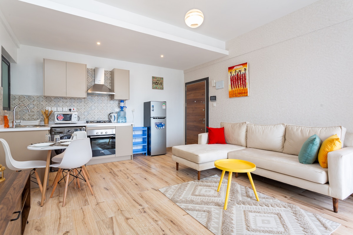 This is a beautifully designed 1-bedroom apartment which offers a warm and modern retreat. It is fully furnished with high-quality pieces for a truly effortless stay. Location: Right next to Ngong Road(200M), connecting you seamlessly to major suburbs and attractions. Ammenities: Everything you need is right outside your door. 50M from the apartment you'll find Carefour Supermarket, Ashaki Grill and other cafes. Also, its about 5-10mins from Yaya Centre.