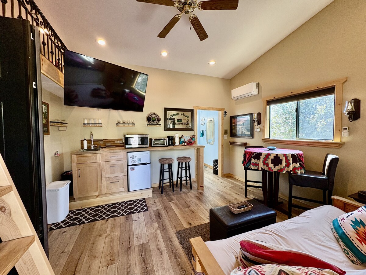 SENDERO DE 100 GIGANTES a unos 30 minutos en coche con un par de secuoyas “Monarca” a pocas millas de distancia de MR51. “Creekside Cottage” es una explosión familiar y apta para mascotas del pasado. Esta cabaña histórica fue una de las primeras construidas en Pine Flat/CHS. Junto a Capinero Creek. Cabaña totalmente restaurada, con madera recuperada, materiales, electrodomésticos y muebles. La mitad delantera de la cabaña es una encantadora casa de campo vintage tipo estudio, además de un dormitorio y un baño completo. La mitad trasera es un vestíbulo con lavandería y una litera de "rancher"