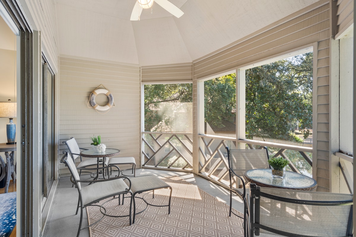 Disfruta de esta elegante villa de un dormitorio en el segundo piso ubicada a 100 metros de la playa en la hermosa isla de Kiawah. Tiene un techo abovedado de 18 pies con una hermosa vista a la laguna desde el porche cerrado. El dormitorio ofrece una cama tamaño king, escritorio, vestidor y un baño remodelado. La cocina totalmente equipada incluye una mesa de comedor para cuatro personas. La villa también cuenta con un nuevo sofá cama tamaño queen, suelos de madera en todas partes, lavadora/secadora y una plaza de aparcamiento dedicada inmediatamente delante del edificio.
