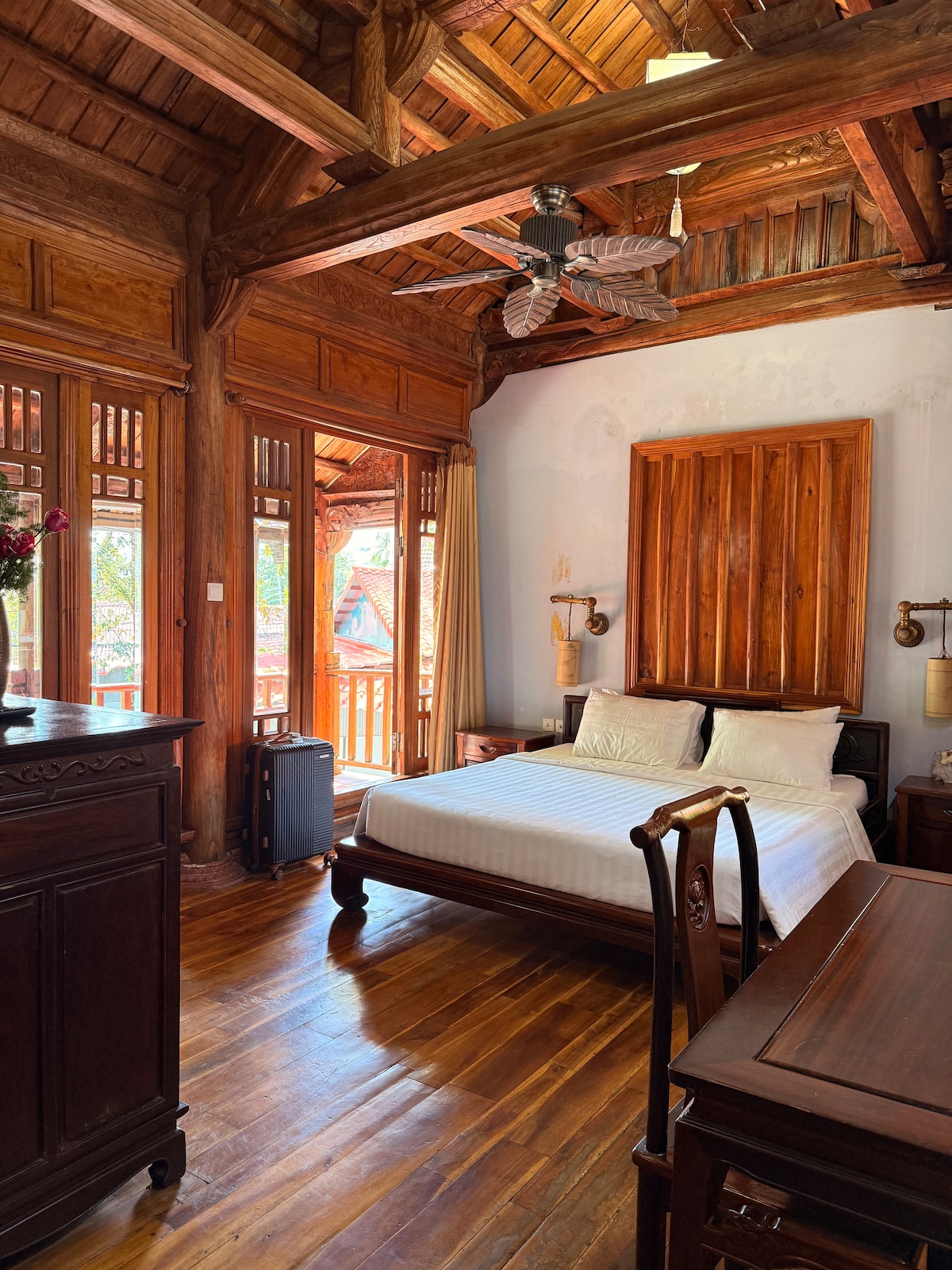 A cozy, character-filled stay in a beautifully crafted wooden room. Sleep comfortably on a plush bed, enjoy warm natural light, and step out onto your private balcony for fresh air and leafy views 🌿 Perfect for couples or solo travelers looking for a calm, authentic space with modern comforts. A warm retreat that feels local, timeless, and inviting — ideal for unwinding after a day out.