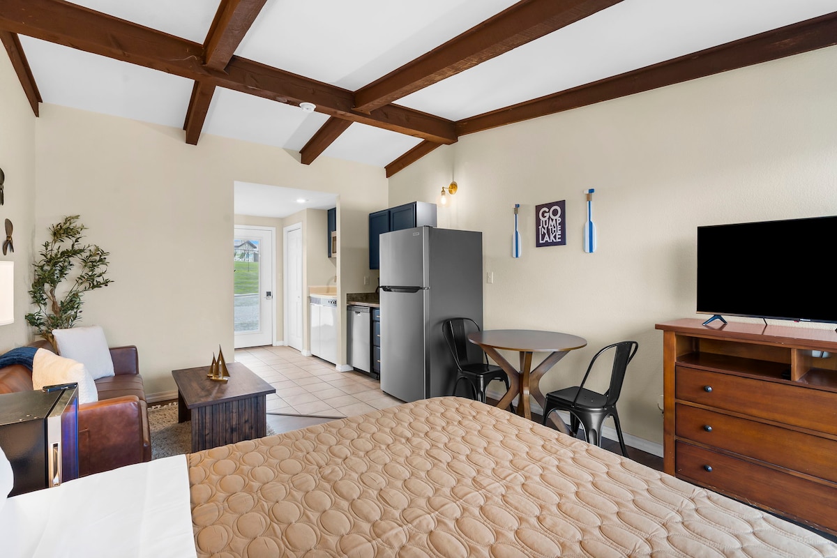 Este estudio privado de spa está diseñado para la máxima relajación, con sauna en la habitación, jacuzzi para dos personas, silla de masaje de cuerpo completo y TV de pantalla plana, todo para tu uso exclusivo. Disfruta de wifi gratuito y aparcamiento privado en el lugar. A solo unos pasos de tu puerta, un camino pintoresco conduce al impresionante lago Table Rock, perfecto para tomar el sol o actividades acuáticas.