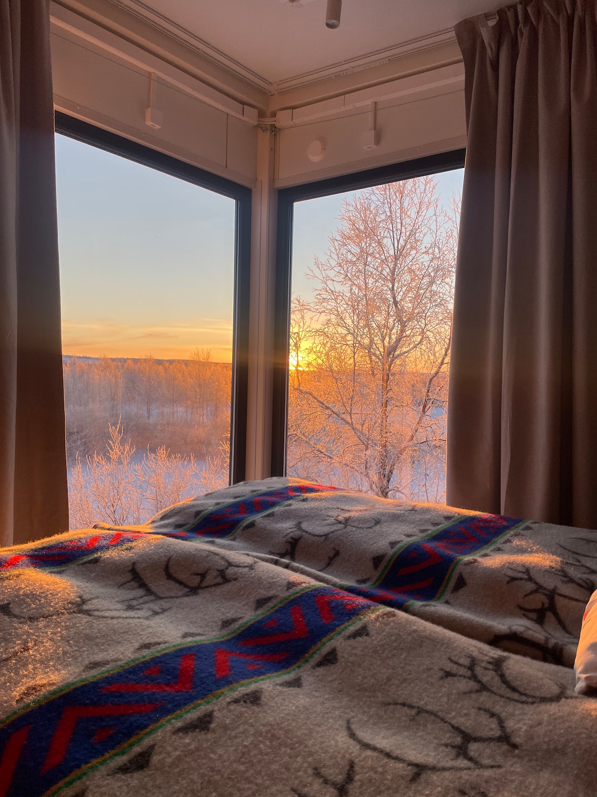 Trivsamt och naturnära boende vid en av Sveriges bästa laxälvar Lainioälven. Perfekt för fiske, vandring och lugn. Här bor du i en fristående gäststuga med stora panoramafönster och magnifik utsikt över det öppna landskapet. Njut av midnattssol, norrsken och stillheten direkt från sängen. På gården bor en familj som arbetar med renskötsel, samisk kultur och jojk. Det finns även en samisk silversmäd på gården. Aktiviteter som kan erbjudas: Snöskovandring, lassokastning, lokal guidning och jojk