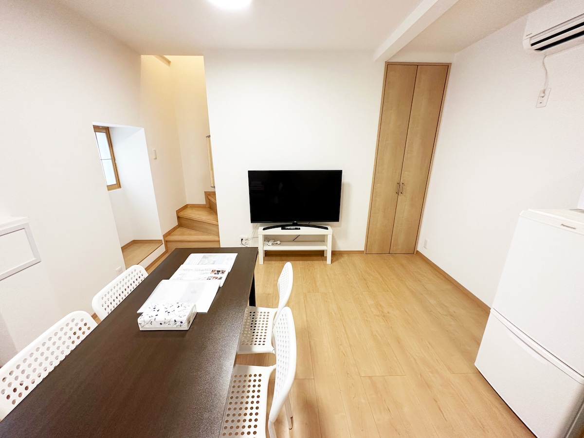 🍃 Casa moderna de estilo japonés recién construida (2024) Casa privada de 2 pisos con estacionamiento, 4LDK (92㎡), hasta 8 huéspedes. Ubicación A 2 minutos a pie de la estación de Kishinosato-Tamade, a 7 minutos de la estación de Tamade. Fácil acceso al aeropuerto de Kansai, Namba y Shinsaibashi. Características Estacionamiento privado, calefacción por suelo radiante, baño con calefacción y secado, lavavajillas, lavadora-secadora. Supermercados y restaurantes cerca. Zona residencial tranquila con vegetación. ✨ Ideal para familias y grupos, ofrece una estancia relajante que se siente como en casa.