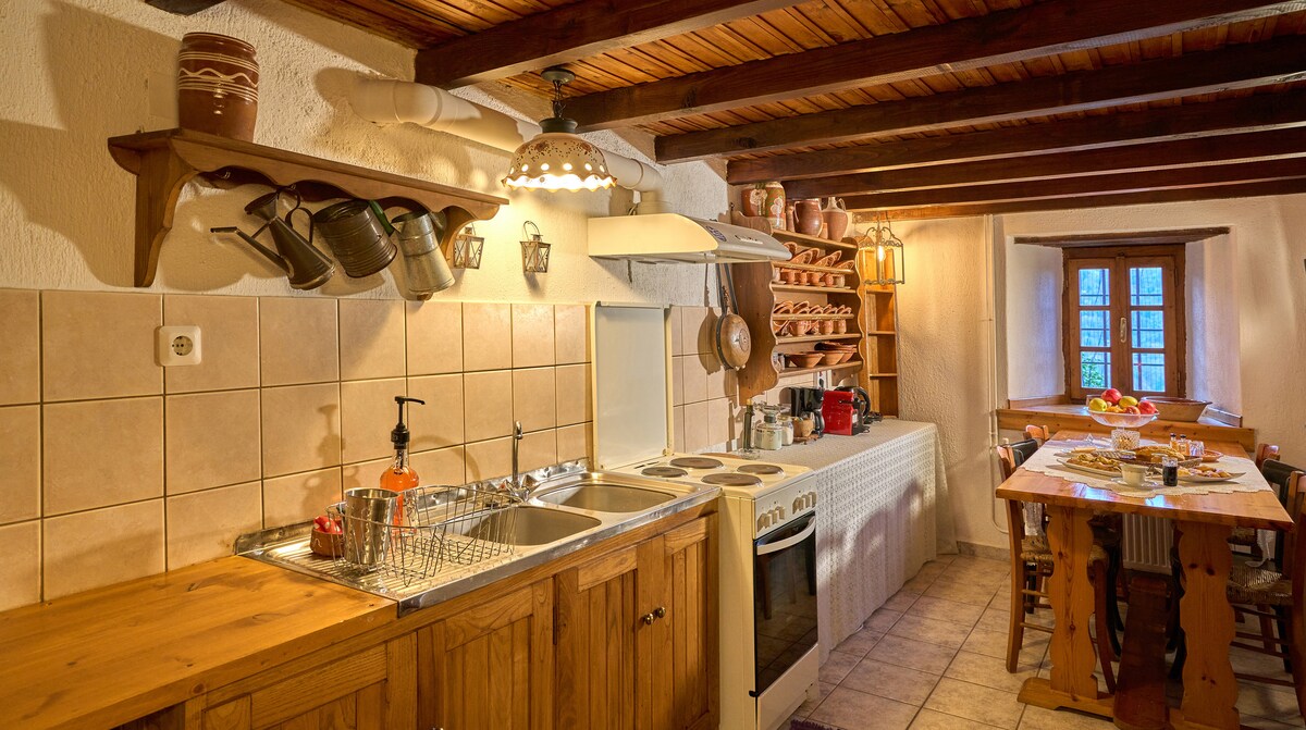 En el pueblo tradicional de Makrinitsa, subiendo y caminando 200 m por un camino pavimentado, llegarás a la fuente de Tsoni. Al lado se encuentra la casa de piedra completamente renovada, ideal para pasar momentos de tranquilidad y relajación mientras contempla la vista panorámica que se le ofrece generosamente. Un espacio sencillo y austero, como corresponde a un pueblo de Pelión.