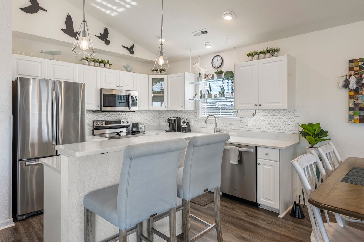 Esta es la unidad de arriba de una casa de dos unidades, y está situada en el centro de Kill Devil Hills, a unas 0,6 millas de la playa. El interior está elegantemente decorado con un plano de planta abierta y techos de catedral. Tiene una cocina completa con casi todo lo que se te ocurra, con una gran mesa de comedor y una isla de cocina. La sala de estar tiene un sofá envolvente hecho para relajarse y un televisor de 85 pulgadas con sonido envolvente Dolby Atmos 9.1 para relajarse y ver tus programas favoritos o algo nuevo.