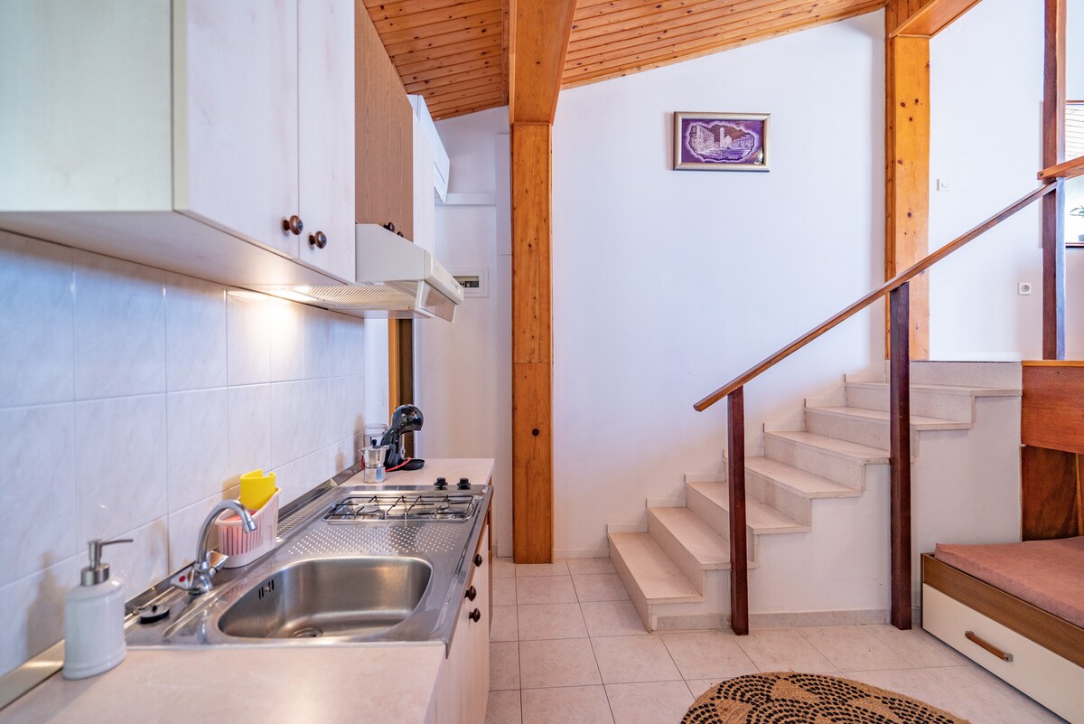 ¡Este departamento está recién renovado en 2025! Amplio y acogedor apartamento estudio loft con un encantador balcón con vista al mar ubicado en el tercer piso de nuestra casa familiar “Veli Bok”. Ideal para una pareja. Nuestra casa se encuentra a 20/25 minutos a pie del puerto/plaza principal, que está a 1,5 km/2 km de distancia.