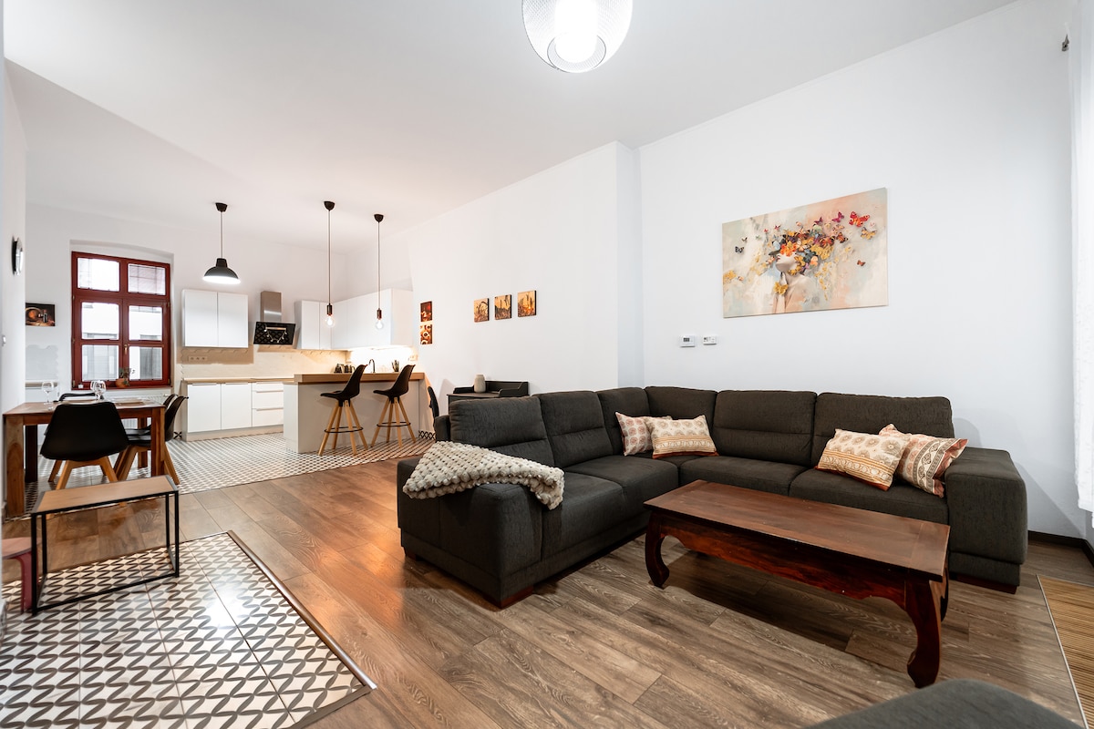 Lujosa y moderna vida en un elegante departamento de 3 dormitorios ubicado en el centro de la ciudad. Tiendas, restaurantes y paradas de autobús están a menos de 100 metros del alojamiento. El apartamento recientemente renovado está equipado con muebles y electrodomésticos de alta gama, altavoces de techo incorporados, sistema de audio 5.1, TV inteligente 4K de 55 pulgadas, TV inteligente en el dormitorio, una enorme ducha a ras de suelo y muchos más. El diseño es realmente único y algo que no verás en ningún otro lugar.