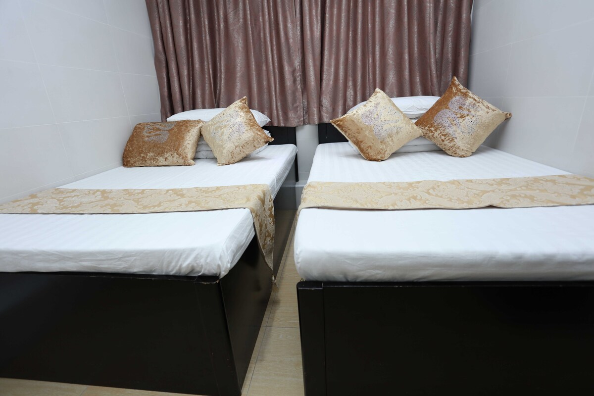 It is a cozy and comfortable room that can accommodate two people. The room is furnished with two single beds, and a study desk. There is a large window that lets in plenty of natural light. The en suite bathroom is equipped with a shower, toilet .This room is ideal for two friends or siblings traveling together who would like an affordable private space to stay.地點優越,前往熱門商店和餐廳非常便捷。