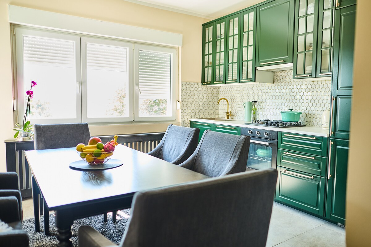 Nuestra hermosa finca se encuentra a 40 km de Zagreb, en Zagorje, una de las regiones más coloridas de Croacia continental. La finca se encuentra en un maravilloso terreno de 2000 m2 y está lleno de plantas, árboles y flores extraordinarias. La orientación de la finca es SW-W, que da a los huéspedes tanto un sol durante el día como una vista asombrosa con la puesta de sol. Tres puntos principales de la finca son la villa principal, la piscina y la casa de huéspedes rústica. La villa principal está rodeada de las dos amplias terrazas que entran en la planta baja con mesa de comedor para diez, cocina agradable y totalmente equipada y una enorme sala de estar con la chimenea. La esquina de Bella Vista con cinco sillones cómodos está situada en una parte oeste de la planta baja. ¡La vista y la puesta de sol son impresionantes! En el primer piso se puede encontrar el dormitorio principal con la enorme terraza, bonito baño jacuzzi y un espacio más pequeño con un sofá cama para dos. En el segundo piso hay otro dormitorio con cama doble, baño con la ducha de masaje y un vestíbulo con una mesa de escritura antigua y soffa para dos. La piscina está a 8,5 x 4,5 m, equipada con la máquina de natación y la ducha solar. La piscina está abierta desde 1,5.-15.10. La casa de huéspedes está cerca de la piscina. Es una casa rústica con el gran porche. Tiene una cocina, baño, sala de estar y un dormitorio muy bonito en el segundo piso con vistas a la piscina. La finca está en una zona muy tranquila y relajante llena de pequeñas ciudades, pueblos con productos alimenticios nacionales y castillos históricos. Al mismo tiempo, está muy cerca de la capital croata de Zagreb (a 30 minutos en coche), de la costa croata (a menos de dos horas en coche) o de los lagos de Plitvice (a 90 minutos en coche). COCINA diaria, el servicio de limpieza puede ser organizado de forma adicional por nuestro Nada, que es muy bueno para preparar especialidades domésticas. ¡Ven y disfruta! ¡ Este es un verdadero paraíso en cualquier época del año!