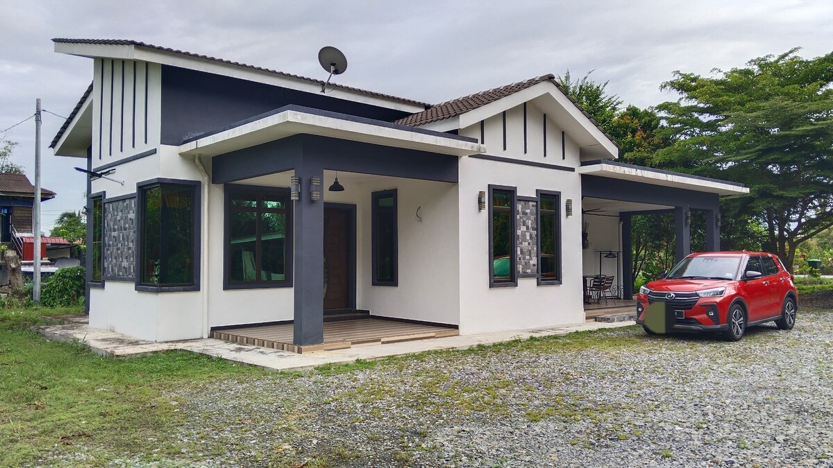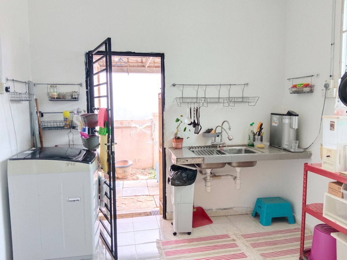 Casa de campo, amplio estacionamiento. 2 habitaciones : Habitación 1 - una cama queen Habitación 2 - dos camas individuales Todas las habitaciones están equipadas con aire acondicionado y ventilador de techo. Extra : 1 toto, 4 almohadas y 1 colchón 2 baños. Instalaciones: refrigerador, lavadora, televisión (Google TV), olla arrocera, hervidor de agua, utensilios de cocina, estufa individual, toalla, manta, alfombrilla de oración, plancha, percha, té, azúcar.