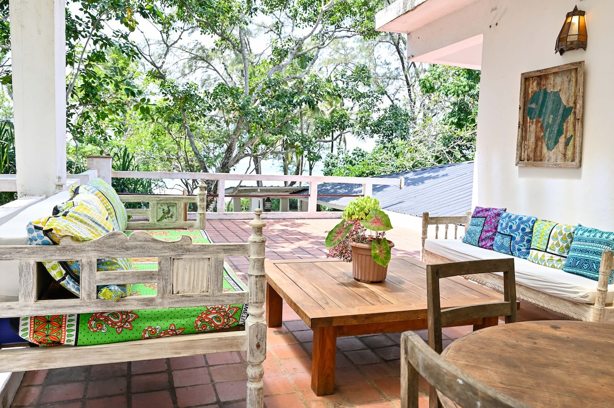 La terraza con vista al mar combina dos amplios dormitorios con baño y un patio rústico semi sombreado sobre nuestra casa familiar, rodeado de bosque autóctono, con vistas a la playa Diani. La habitación con vista al mar cuenta con una cama tamaño king, mientras que la habitación Kuzi tiene dos camas (una tamaño king y una queen). El acceso a la terraza se realiza a través de una escalera exterior. Hay disponible una zona de cocina básica con fregadero, hervidor, microondas, cubiertos, platos, tazones, etc. y quemador superior (sin horno). Ten en cuenta que este no es un alojamiento tipo "casa".