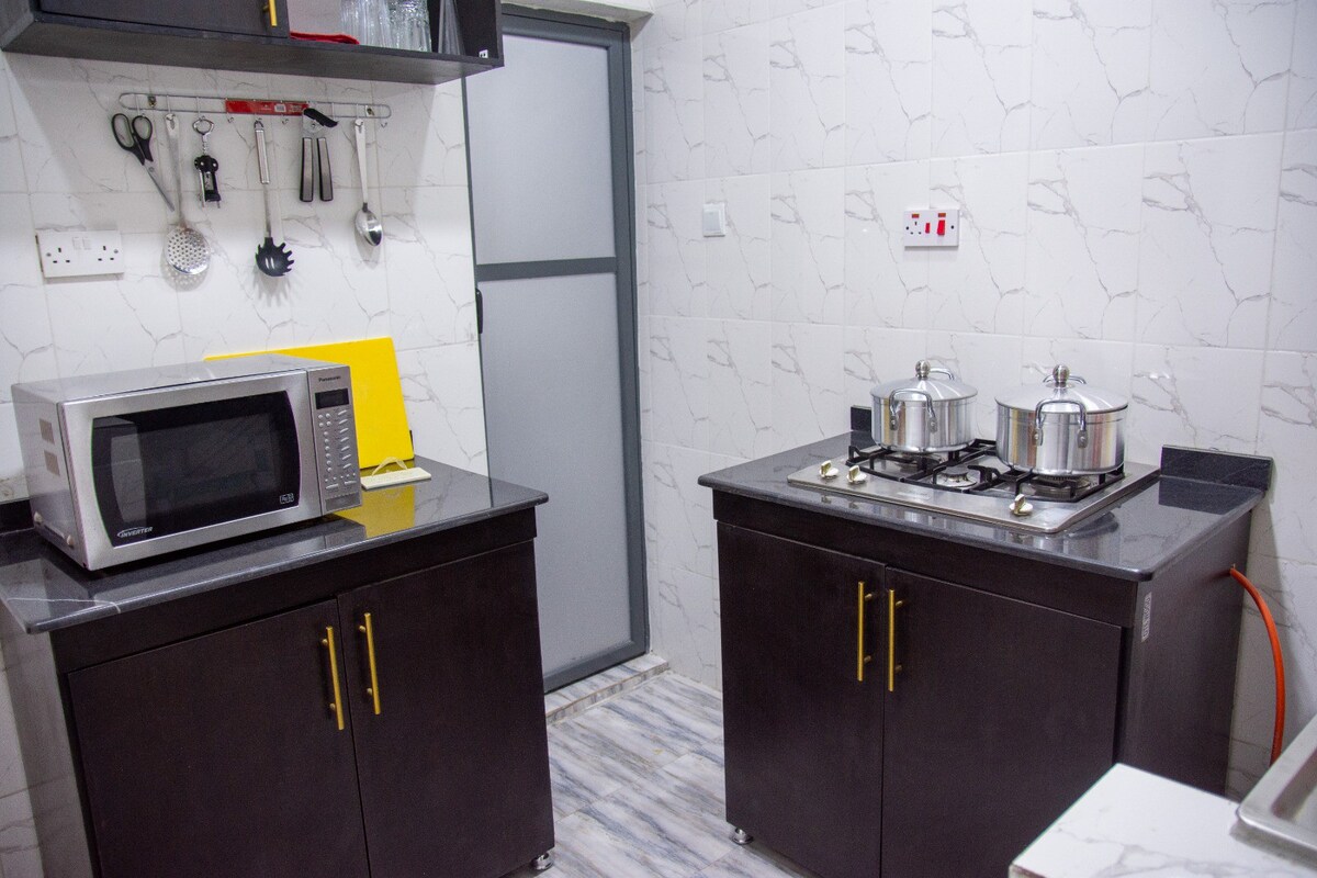 24/7 Electricity Good Workspace Full Kitchen: We have a gas stove, oven, microwave, and fridge. We also provide pots, spoons, and plates for you. ABOUT THE SPACE: The living room is big and has nice chairs. The bedroom has a large, comfortable bed and a cool AC to help you sleep well.