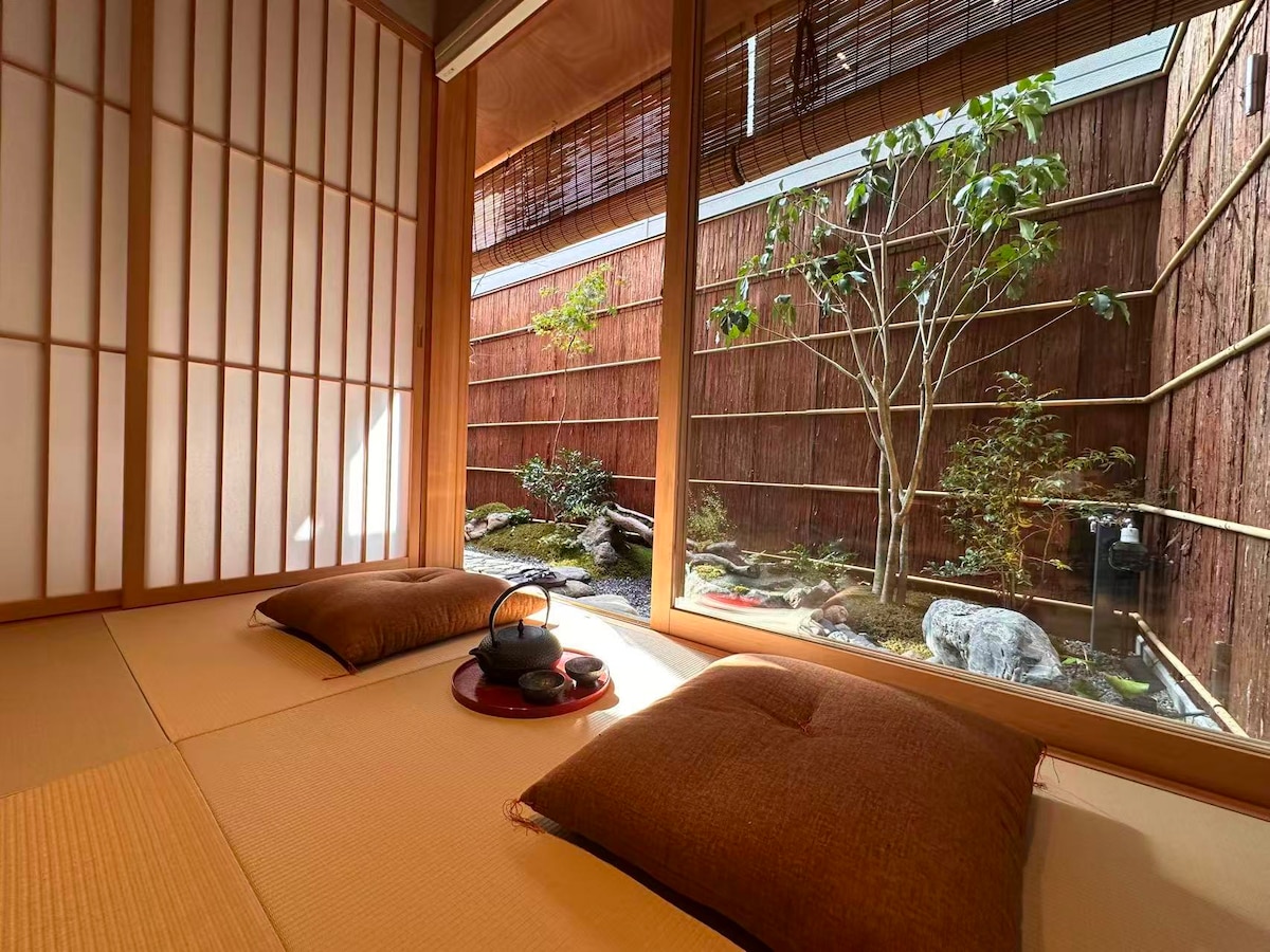 Esta Machiya de 2 plantas (100 m²) situada cerca del castillo de Nijo, a 10 minutos a pie de la estación de Nijo, puede cumplir con toda tu imaginación sobre Kioto, con jardín tradicional, habitaciones de tatami y bañera semiabierta. El jardín sigue la filosofía japonesa de las estaciones, con flor de sakura en primavera, un pequeño estanque rodeado de verdes en verano, arce rojo en otoño y nieve en el pino negro japonés en invierno. Adopta el hermoso ritmo de la naturaleza en el estilo de vida tradicional con la comodidad de las lujosas instalaciones modernas.