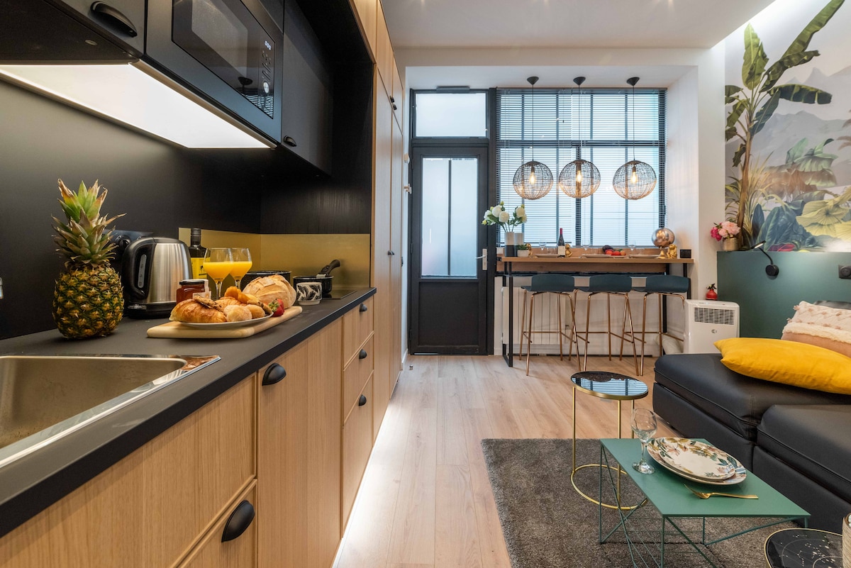 Este estudio decorado con buen gusto con el espíritu de una suite de hotel, le hará vivir una experiencia excepcional en el corazón del París de los artistas. Situado en el séptimo y último piso de un edificio de piedra de talla (ascensor hasta el sexto), sus 35 m2 ofrecen un nivel de confort digno de un hotel de 4*: cama Queen Size, ducha XXL, equipo de música, tranquilo... El pequeño plus para que su estancia sea inolvidable: ¡la vista panorámica de los tejados y la Torre Eiffel desde las dos grandes claraboyas de la sala de estar!