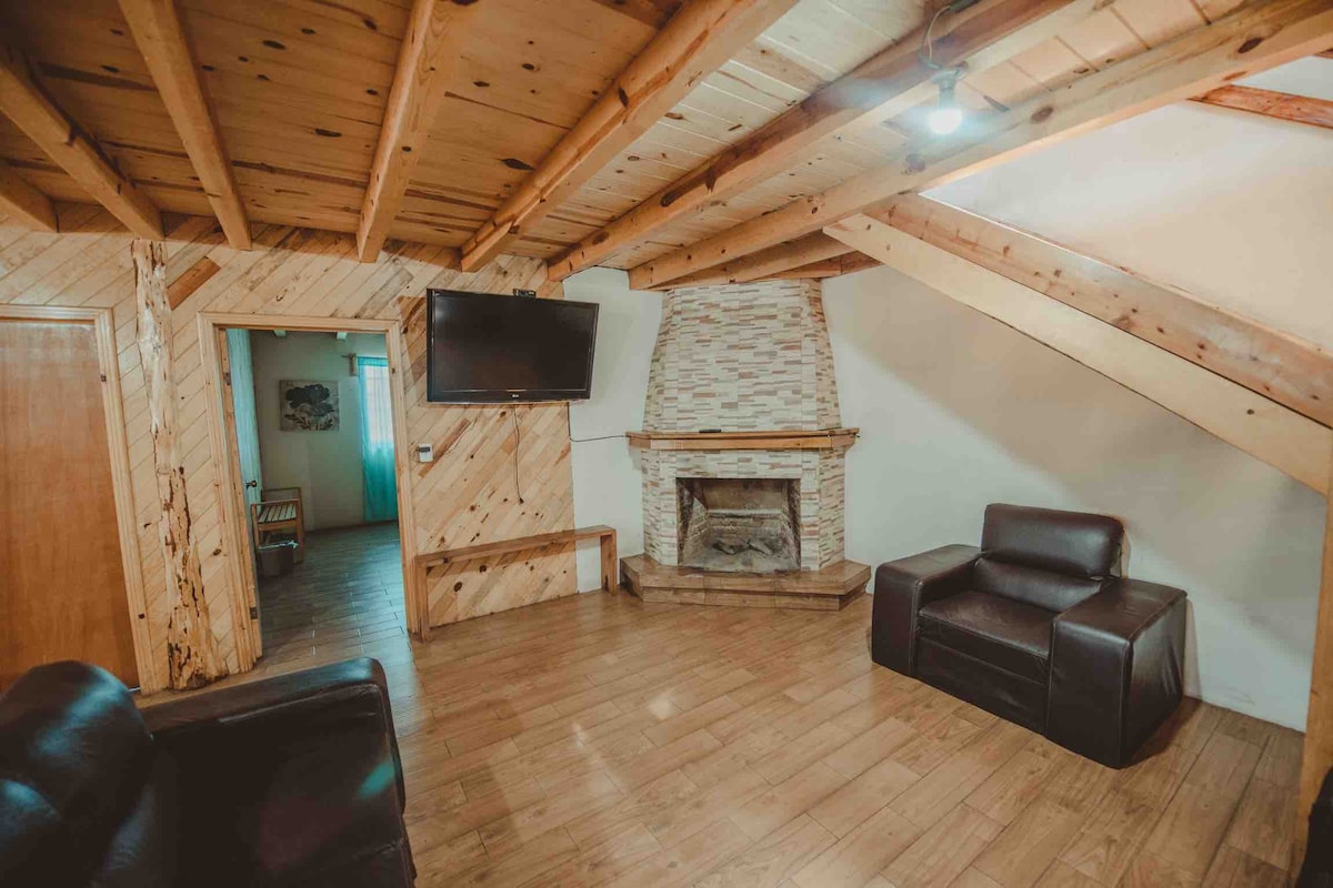 Cabaña con servicio de luz agua y drenaje Chimenea Sala Escalera para el ático Comedor para 6 personas Abanico de aspas de 4 velocidades Cocina con refrigerador Asador exterior para carnes asadas Microndas Estufa Licuadora Tostador Cafetera 1 juego de platos para 6 personas 1 juego de vasos para 6 personas 1 juego de sartenes 1 juego de utensilios de cocina 1 juego de cubiertos para 6 personas bote de basura Velador de noche servicio 24 horas