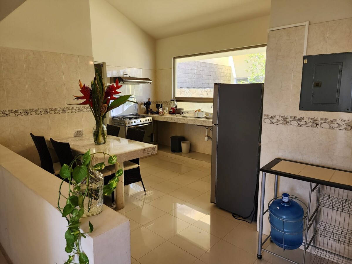 Habitación ideal para parejas o personas solas que deseen disfrutar de la tranquilidad y descansar, con entrada independiente separada de la casa principal. 2 camas individuales (se pueden convertir en King size) aire acondicionado, ventilador, clóset, baño completo, Wi Fi, área de trabajo, TV, frigobar, agua caliente, terraza con mesa y sillas, jardín y amplia alberca de uso común. En área común puede preparar alimentos. En estancias mayores de 1 semana, los desayunos son de lunes a viernes.