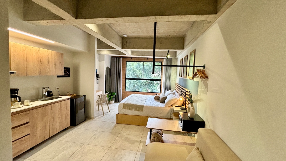 • Amazing location in heart of Poblado: "Oasis in the middle of the best part of the city, walking distance to everything” • Modern, fully furnished Loft • High speed 100 Mb WiFi • Loads of nature around • On-site staff to help you with your needs 24/7 • Air Conditioner • Pool + Hot Tub in the common areas • 5 mins walk to best restaurants, cafes, malls. 15 mins walk to Poblado and Lleras Park • Fully stocked kitchen with appliances • 43” Smart TV with Apps • Transparent prices