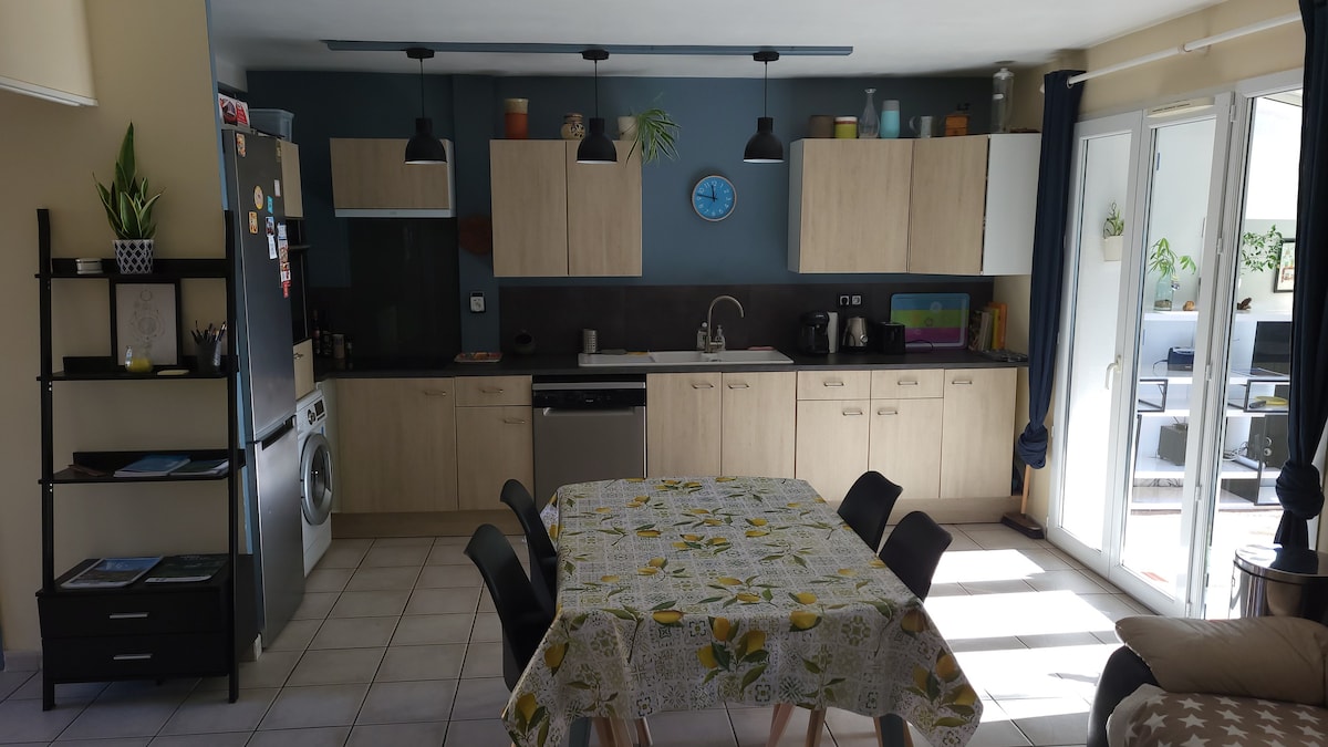 Venez séjourner dans un appartement de plein pied dans une maison de charme. Entièrement rénové avec des objets chinés vous découvrirez une ambiance stylée et agréable. Vous bénéficiez d'une terrasse et d'un jardin zen avec bambou et lumières tamisées le soir qui vous permettront de profiter du calme après le retour des plages climatisé. Votre place de parking vous attend dans le jardin pour charger et décharger facilement PETIT bonus un terrain de pétanque pourra égayer vos soirées