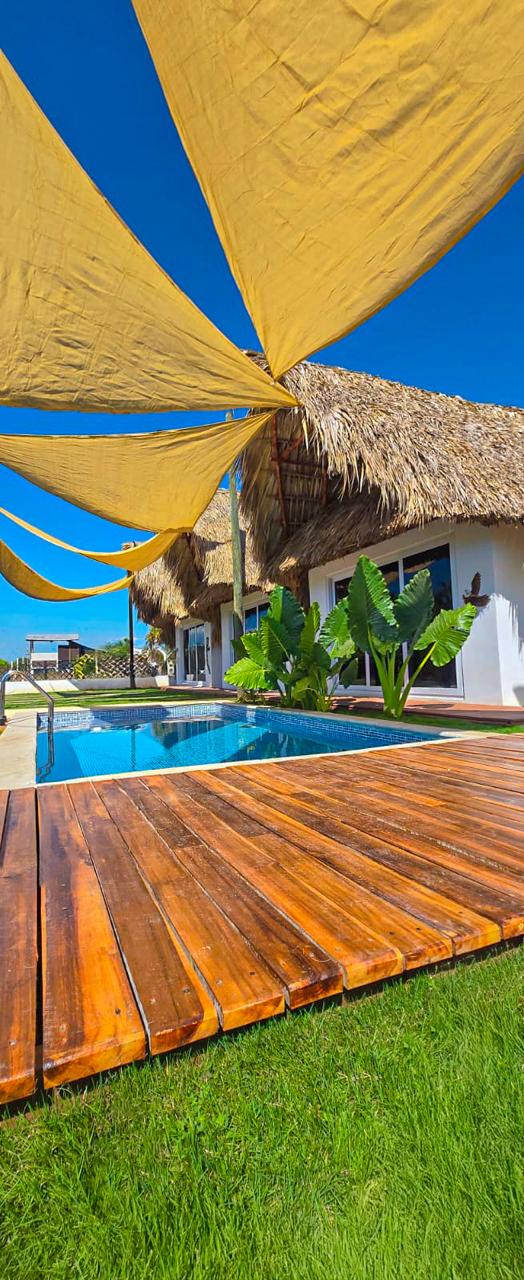 Una casa muy cómoda en un estilo moderno, cuenta con aire acondicionado en todas las habitaciones y ventiladores en áreas comunes. Puertas de pvc y puertas y ventanas de cedazo, bien iluminada, segura y con varios ambientes recreativos; una mesa de billar, cancha de papi futbol, jacuzzi y piscina con wet bar semicubiertos que permite disfrutar del sol. Dos pérgolas con tres hamacas una cómoda terraza equipada con una barra, bancos y churrasquera.