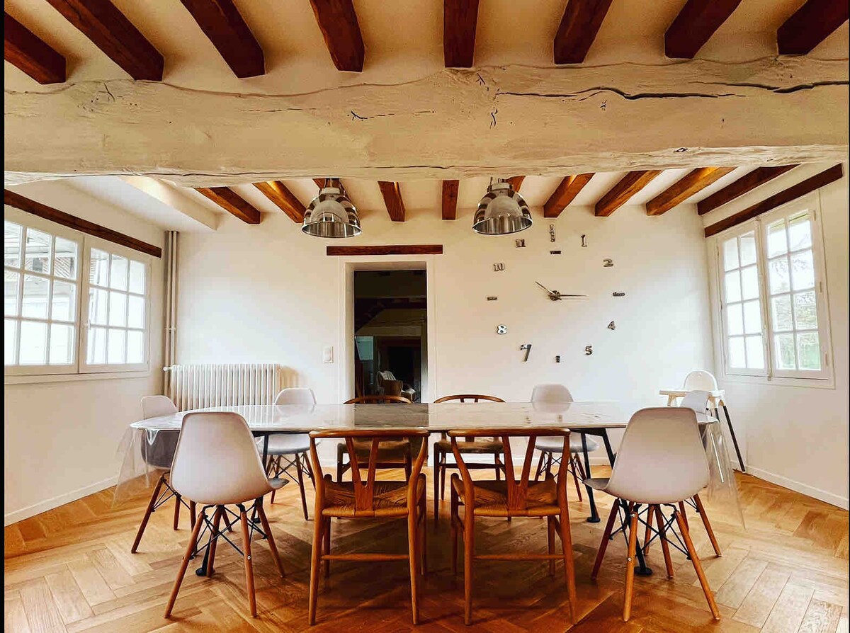 À 1h20 de Paris . Dépaysement total pour cette longère intégralement rénovée calme et sans aucun vis à vis ·Jardin 18000 m2 … aire de jeux balançoire 🏓 · Piscine 🏊♂️ 15x5m chauffée du 01/04 au 15/10. · Terrain Tennis …raquettes et 🎾 · Terrain Pétanque … boules · Barbecue Kamado XXL · Billard 🎱 · Babyfoot · Karaoke 🎤 (🤪) · Ecran TV 215cm orange Netflix · WIFI fibre · Cheminée bois fourni · Cuisine dînatoire 5 chambres 4 salles de douche 1 salle de bain 5 toilettes What else !