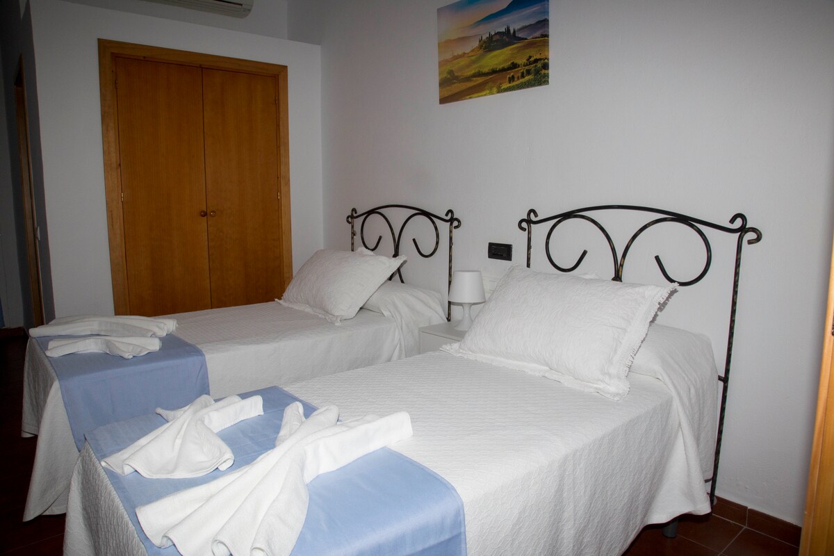 Habitacion de 2 camas de 90 y con su baño completo. Esta situada en la primera planta algo interior pero se puede acceder a una terraza exterior compartida. Ropa de cama, toallas, gel de baño y secador de pelo bajo petición. Tv y aire acondicionado. Situada a solo 2 minutos de la plata de Valdevaqueros y dolo 5 minutos del centro histórico. Se accede a ella por escalera o por ascensor.