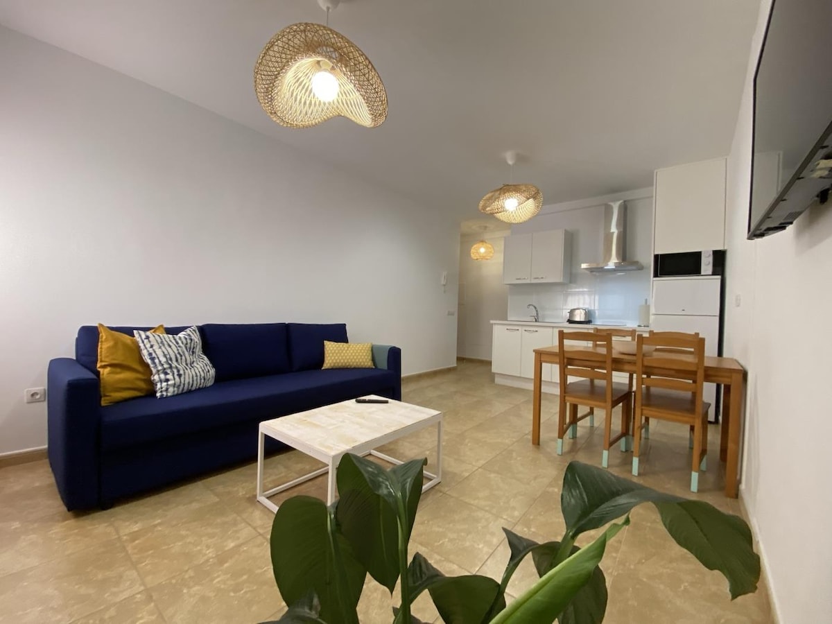 Apartamento Salitre La Caleta El Hierro, Canarias. Zona costera muy tranquila, salón, Smart tv 55', cocina con electrodomésticos, WiFi, lavadora, hab. grande cama matrimonio con tv, hab. pequeña con diván para dos personas, armarios grandes, suplemento cama doble hinchable, cuna y trona para bebé, baño completo con plato ducha, terraza grande con 2 hamacas, mesa y sillón exterior vistas al mar, piscinas naturales agua de mar a 100m, 2min del aeropuerto y 5 del Puerto. Aparcamiento en la puerta.
