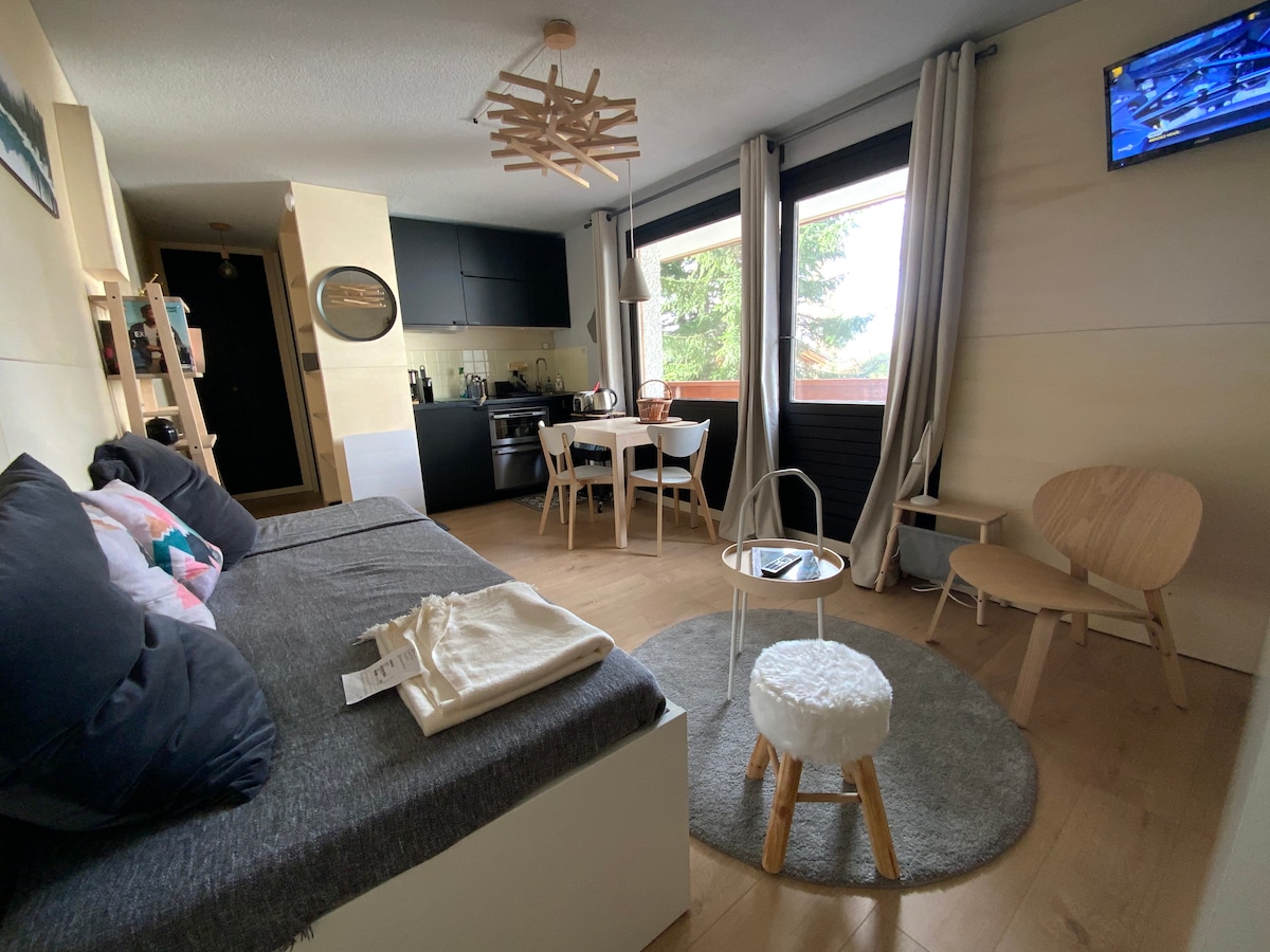 Estudio de 20 m2 Planta baja. Completamente reformado . 2 literas 1 cama sofá cama de 160 . Ahorro de espacio para poder circular por el estudio cuando se sube. Cocina equipada gran horno tradicional . Cuarto de baño . Con vistas al bosque . A 2 minutos a pie de las pistas. Armario de esquí incluido con el apartamento . A 5 minutos del centro de la ciudad ( supermercado, quesería, etc.) bcp de almacenamiento . Apartamento situado en el complejo de Bouquetins ( notificación waze)