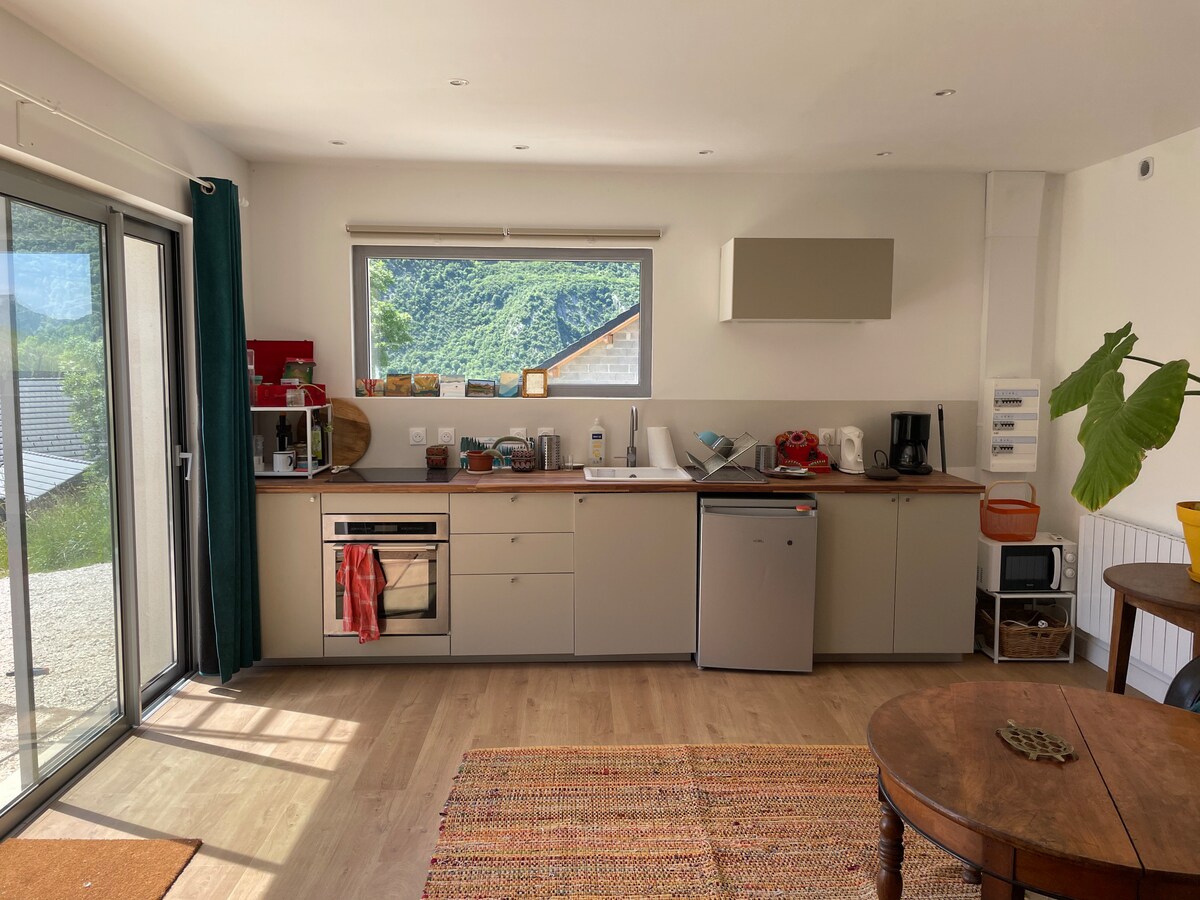 Impresionante apartamento tranquilo, totalmente nuevo, acogedor, con plaza de aparcamiento frente al alojamiento. Orientado al sur, tendrá una bonita terraza y un jardín privado (vistas a las montañas), disfrutará de un acogedor dormitorio con una gran cama doble, una sala de estar con cocina americana totalmente equipada y un baño con inodoro separado. Estará a 45 minutos de las primeras estaciones de esquí o Grenoble, y a solo 25 minutos de Chambéry y Albertville. Autopista a 5 minutos.